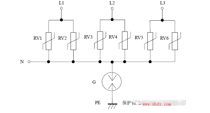 ①優(yōu)點(diǎn):采用“3+1”電路,電路簡(jiǎn)單,三相全保護(hù)。缺點(diǎn):壓敏電阻短路失效后易引起火災(zāi)。最好在每個(gè)壓敏電阻上串聯(lián)一個(gè)工頻保險(xiǎn)絲以防壓敏電阻短路起火。
