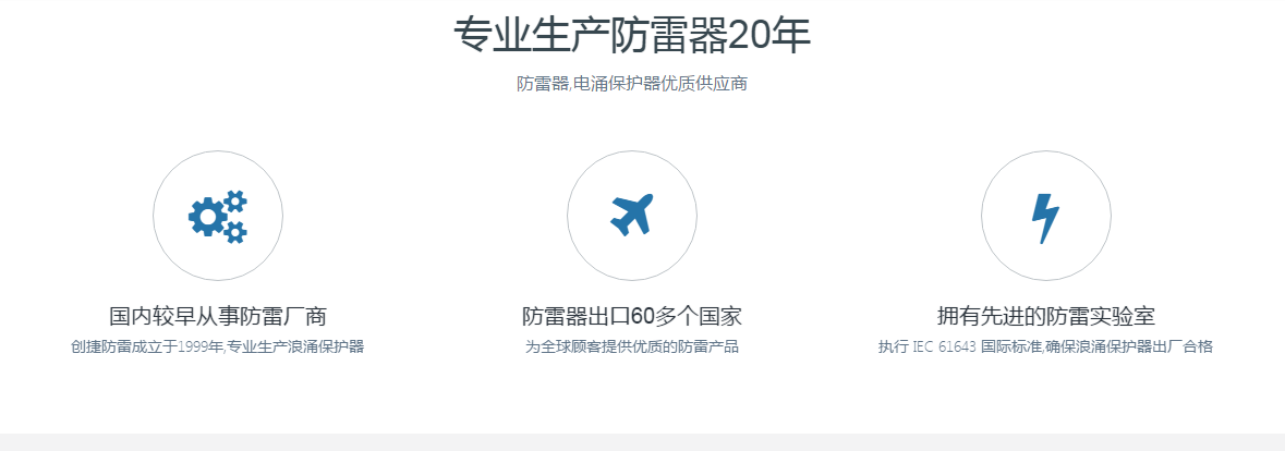 分配電柜線路輸出的電源防雷器作為第二級保護時應(yīng)為限壓型電源防雷器,其雷電流容量不應(yīng)低于20KA,應(yīng)安裝在向重要或敏感用電設(shè)備供電的分路配電處。這些電源防雷器對于通過了用戶供電入口處浪涌浪涌保護器放電器的剩余浪涌能量進行更完善的吸收,對于瞬態(tài)過電壓具有極好的抑制作用。