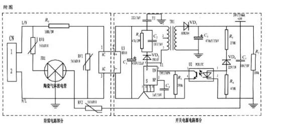 陶瓷氣體放電管的通流容量根據(jù)要求的通流容量選擇,電路采用3RM470L-7.5-L,通流量為5000A。線繞電阻R1起限流分壓作用;貼片整流模塊為開關(guān)電源電路前端整流作用,C1為高壓濾波電容,Y1為去耦電容,電阻R2和電容C2及VD2組成開關(guān)電源芯片MOS管的吸收鉗位電路,保護(hù)芯片,開關(guān)電源芯片采用PI公司的TNY27系列,TR1為高頻變壓器,VD3、C3構(gòu)成高頻變壓器次級(jí)濾波,U2、VD4、R3、R4、R5構(gòu)成開關(guān)電源電路的反饋電路,可將變壓器次級(jí)輸出電壓穩(wěn)定在設(shè)計(jì)值,此防雷抗浪涌電路在實(shí)際使用中取得了較好的效果。