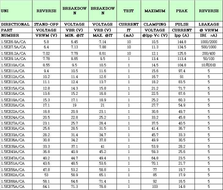 最大反向電壓:6.8-75V