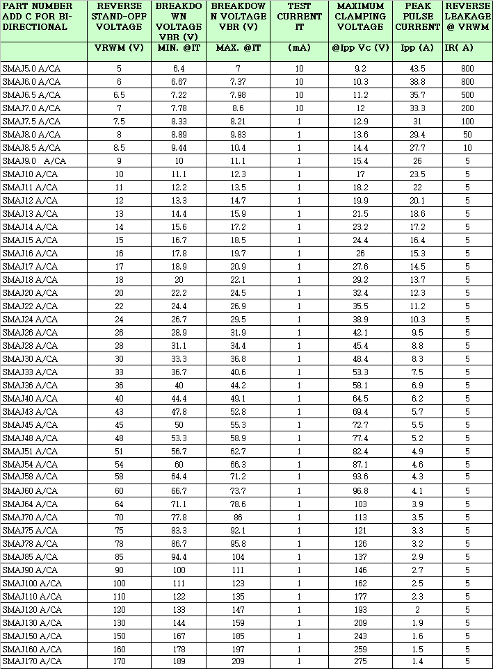 TVS 管和穩(wěn)壓管一樣,也是反向應(yīng)用的。其中VR 稱為最大轉(zhuǎn)折電壓,是反向擊穿之前的臨界電壓。VB 是擊穿電壓,其對應(yīng)的反向電流IT 一般取值為1 mA。VC 是最大箝位電壓,當(dāng)TVS 管中流過的峰值電流為IPP 的大電流時,管子兩端電壓就不再上升了。因此TVS 管能夠始終把被保護的器件或設(shè)備的端口電壓限制在VB~VC 的有效區(qū)內(nèi)。與穩(wěn)壓管不同的是,IPP 的數(shù)值可達(dá)數(shù)百安培,而箝位響應(yīng)時間僅為1×10-12s。TVS 的最大允許脈沖功率為PM=VCIPP,且在給定最大鉗位電壓下,功耗PM 越大,其浪涌電流的承受能力越大。
