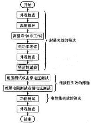 按照原則排序后,還加上一次外觀檢查,主要是為了防止測試篩選過程中由于在不同實驗室之間轉(zhuǎn)運而發(fā)生外觀破損等現(xiàn)象,保證檢驗結(jié)束后的元器件外觀合格。這樣就得到圖1所示的篩選工作流程圖。