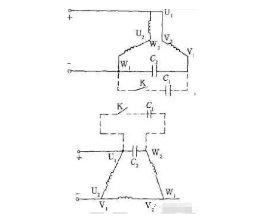 在前文了解到了并入電容裂相的兩種接線方式,分別是△形接線與Y形接線。那么拉開式也有兩種,一種是拉開Y形裂相,另一種是拉開△裂相。⑴當(dāng)電動(dòng)機(jī)是Y形接線時(shí),那么就可將三相電動(dòng)機(jī)其中的任意的二繞組,就比如U與W進(jìn)行串聯(lián),將其稱為一個(gè)主繞組。有了主繞組,就有副繞組,將另外的相繞組進(jìn)行串聯(lián),并配以適當(dāng)?shù)碾娙荩瑢⑵洳⒙?lián)在單相電源上。假設(shè)C2電容較為合適,那么就能夠促使進(jìn)行并聯(lián)的支路電流之間的互差值達(dá)到90°,從而達(dá)到最佳的運(yùn)行效果。⑵當(dāng)電動(dòng)機(jī)是△形接線時(shí),其也是分為主繞組與副繞組,但是由于是△形接線的關(guān)系,繞組W1W2、V1V2與繞組的U1U2會形成自耦變壓器,自耦變壓器會有一種升壓的情況,這就會導(dǎo)致電容器C2最終承受的電壓比單相電源的電壓要高,會達(dá)到電壓值的3倍有余。詳細(xì)原理可見圖4。